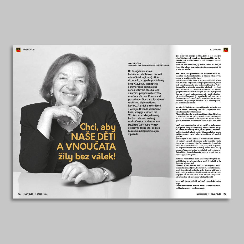 V dalších rozhovorech ke čtenářům Mladého světa promlouvá někdejší první dáma Livia Klausová, o které vychází nová kniha Pavlíny Wolfové, herečka Bára Fišerová vypráví o svém novém pořadu o divadle s názvem Potlesk pro…, o herectví či o svém dávném vztahu s Michalem Penkem a Lukáš Vincour z organizace Zvířata nejíme mluví o ochraně zvířat, o veganství nebo o tom, že pojídání zvířat do moderní společnosti nepatří.