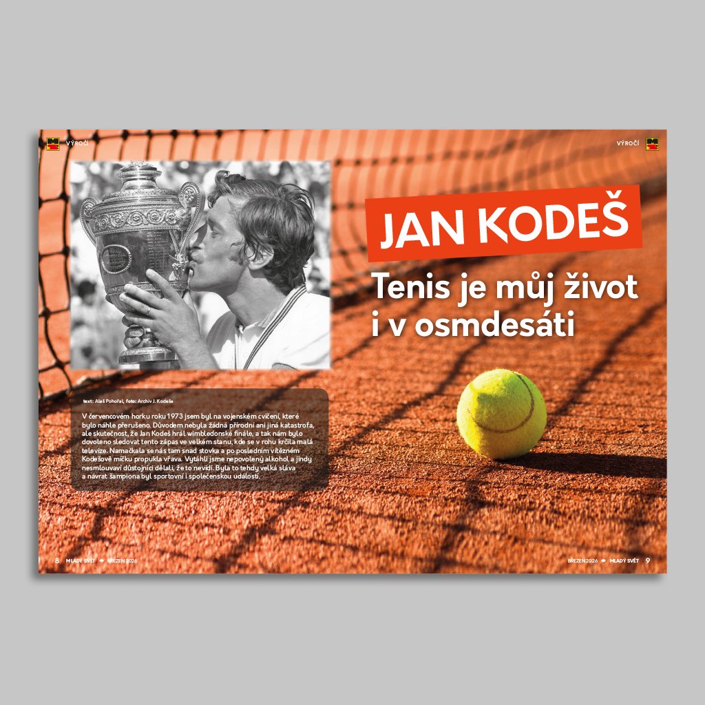 Legendární tenista Jan Kodeš je na titulní straně Mladého světa už celkem poosmé. Zřejmě je v této disciplíně rekordmanem. Nestor české žurnalistiky Aleš Pohořal, který jako „sporťák“ desítky let sledoval jeho kariéru, ve svém skvělém textu připomíná Kodešovy úspěchy, přináší názory na někdejšího nejlepšího hráče světa od dalších tenisových hvězd a hlavně mu blahopřeje k 80. narozeninám, které oslavil 1. března.